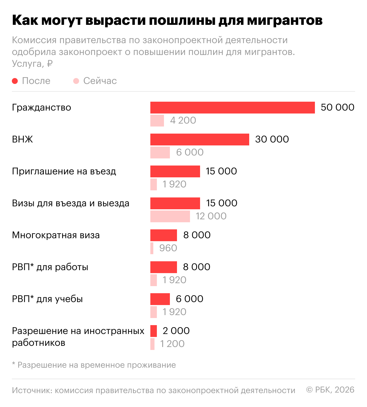 Также будут добавлены новые виды пошлины — замена вида на жительство (6 тыс. руб.) и за выдачу дубликата разрешения на временное проживание, в том числе в образовательных целях (5 тыс. руб.), отметил в разговоре с РБК председатель правления Ассоциации юристов России Владимир Груздев.