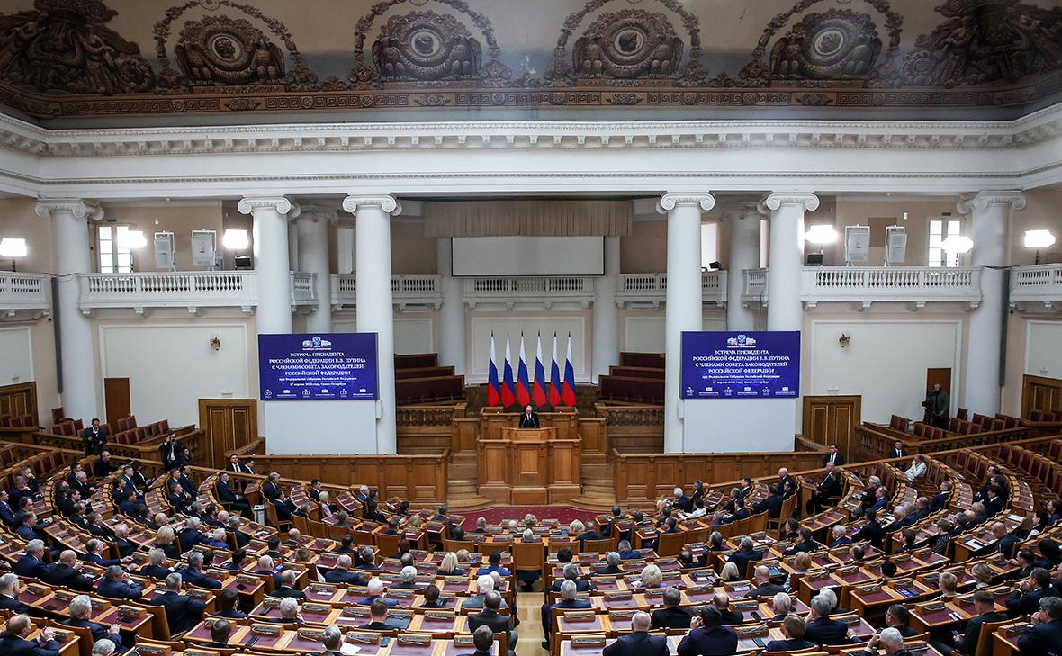 Владимир Путин (в центре) во время выступления на заседании совета законодателей России (Фото: Петр Ковалев / ТАСС)