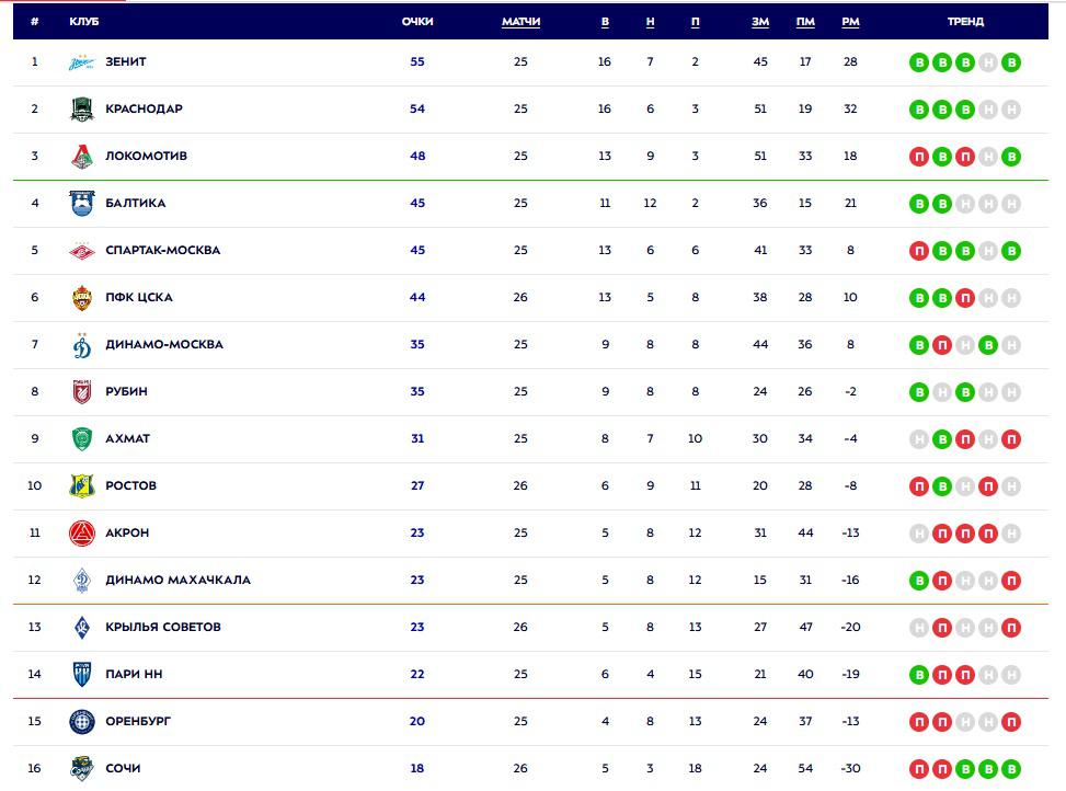 После 25 матчей лидером в турнирной таблице является петербургский «Зенит», набравший 55 очков. На одно очко от него отстает «Краснодар», на третьей строчке с 48 очками расположился московский «Локомотив».