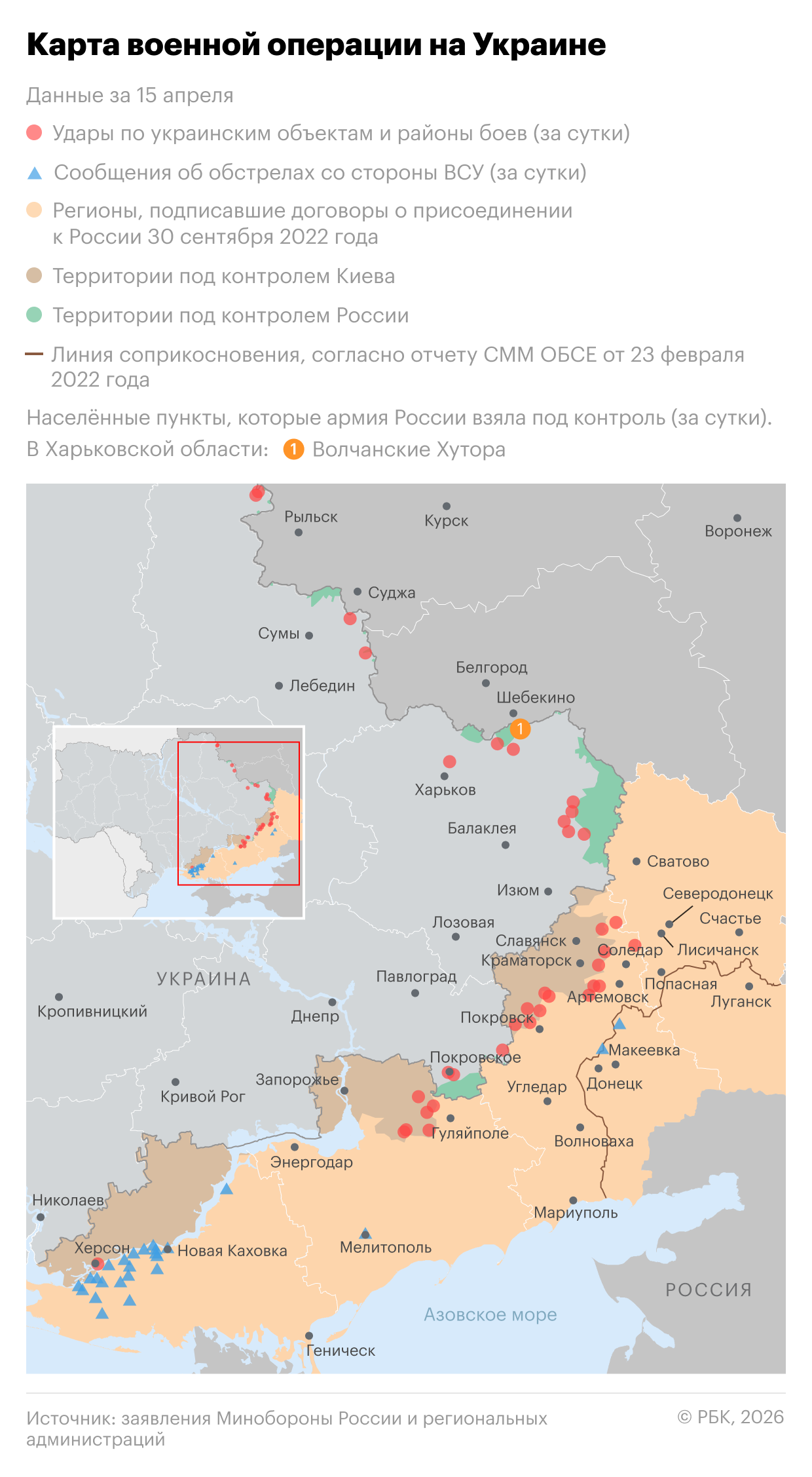 Населенный пункт Волчанские Хутора в Харьковской области перешел под контроль России, сообщило Минобороны.
